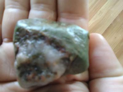 I have inherited my grand fathers rock and minéral collection, therefore I could not tell you where this one was found...it has a two tiered green layered body with an opal like cream colored splotch on top. It is smooth, has a green streak.